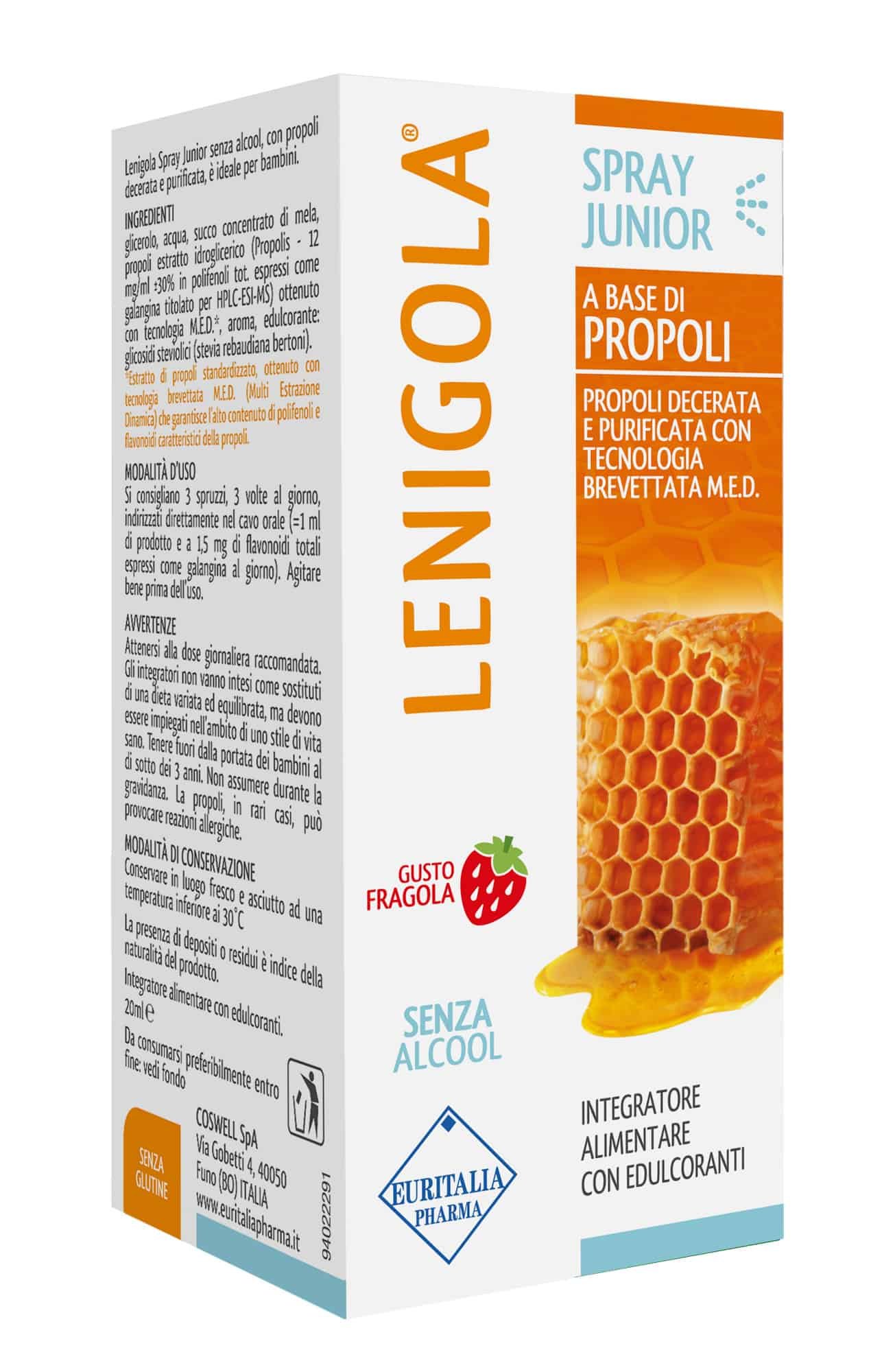 Al delicato gusto fragola, che lo rende ancora più gradevole, Lenigola Spray Junior è senza glutine e senza zucchero, dolcificato naturalmente con Stevia.