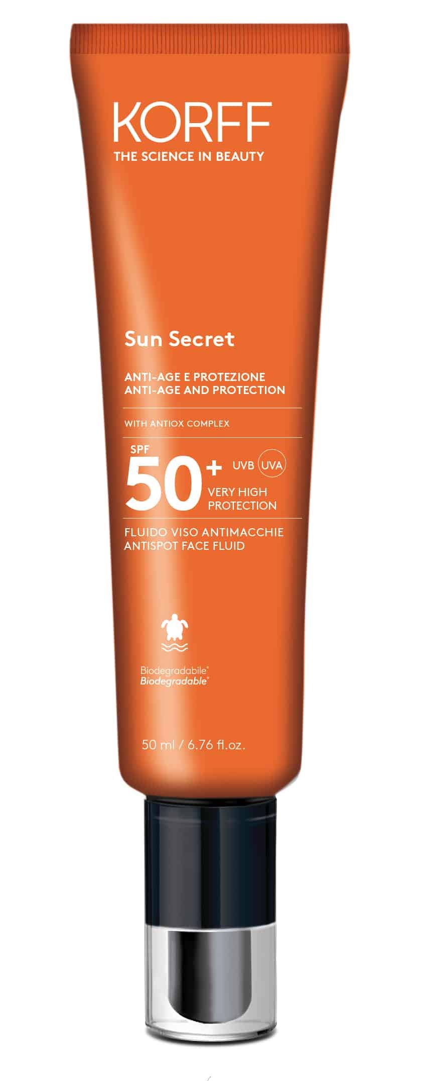 - Korff Sun Secret Fluido Viso (SPF 30 protezione alta – SPF 15 protezione media). Oltre a proteggere la pelle con i filtri UVA e UVB, sono dotati di Antiox Complex con azione antiossidante che contrasta efficacemente la formazione di radicali liberi. Il prezzo è 26 euro.