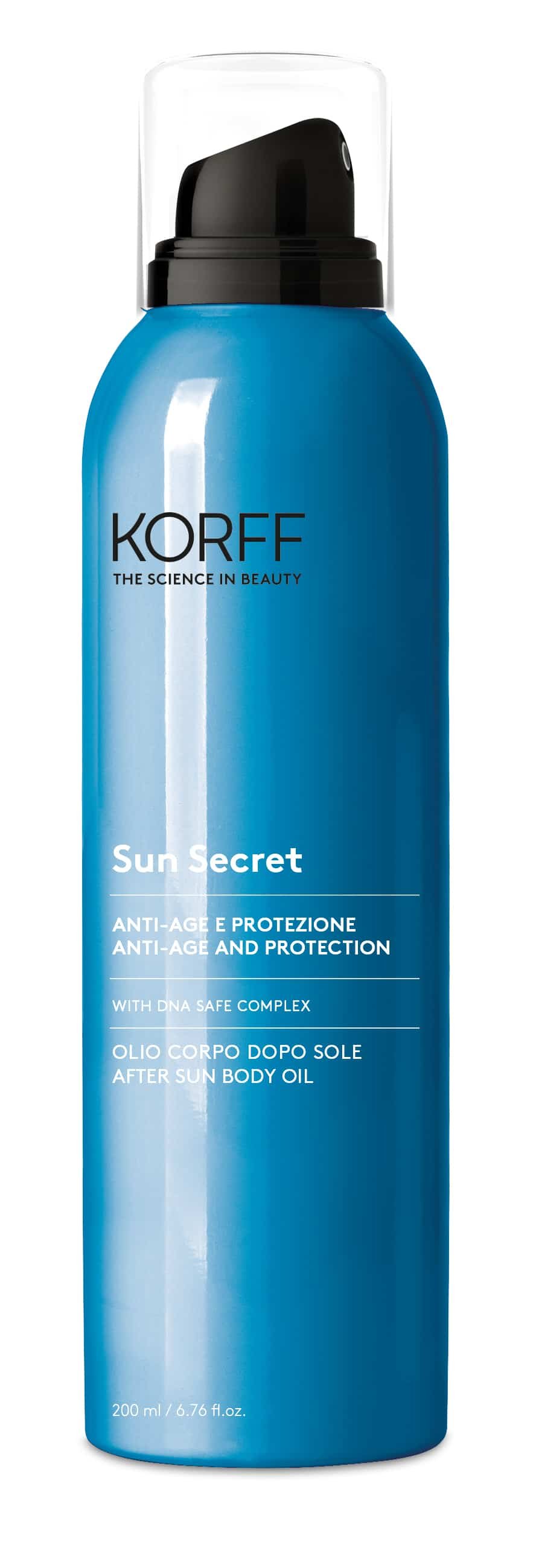 - Korff Sun Secret Olio Corpo Doposole. Grazie alla formulazione con DNA Safe Complex, idrata e lenisce in profondità la pelle stressata dai raggi solari. Il prezzo è 26 euro.