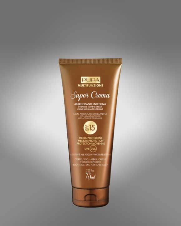 - Super Crema Abbronzante Intensiva SPF 50, SPF 15 e SFP 30 per corpo, viso, labbra, capelli e cuoio capelluto. Idratano e proteggono le pelli più chiare, e grazie a uno stimolatore di melanina, garantiscono un’abbronzatura intensa e di lunga durata. Il prezzo è 22 euro.