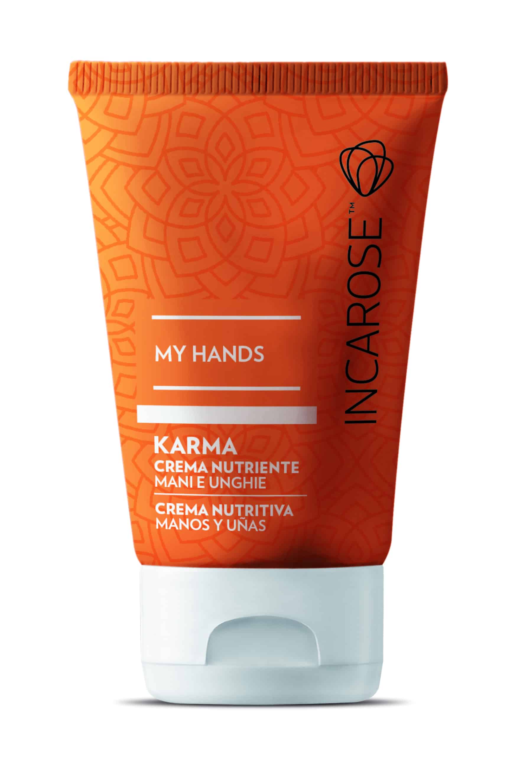 Karma è una crema mani e unghie ad assorbimento rapido: morbida, setosa, meravigliosamente profumata di spezie e legni. Ricca di burro di Cacao emolliente, burro di Mango con funzione antiage e burro di Karitè che nutre ed idrata, esercita un’azione lenitiva ed antinfiammatoria grazie alla presenza di vitamina E.