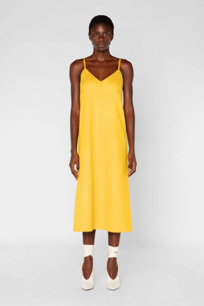 Lo slip dress di colore giallo è minimalista ed essenziale e può essere utilizzato come la giusta alternativa all’abito sottoveste nero.