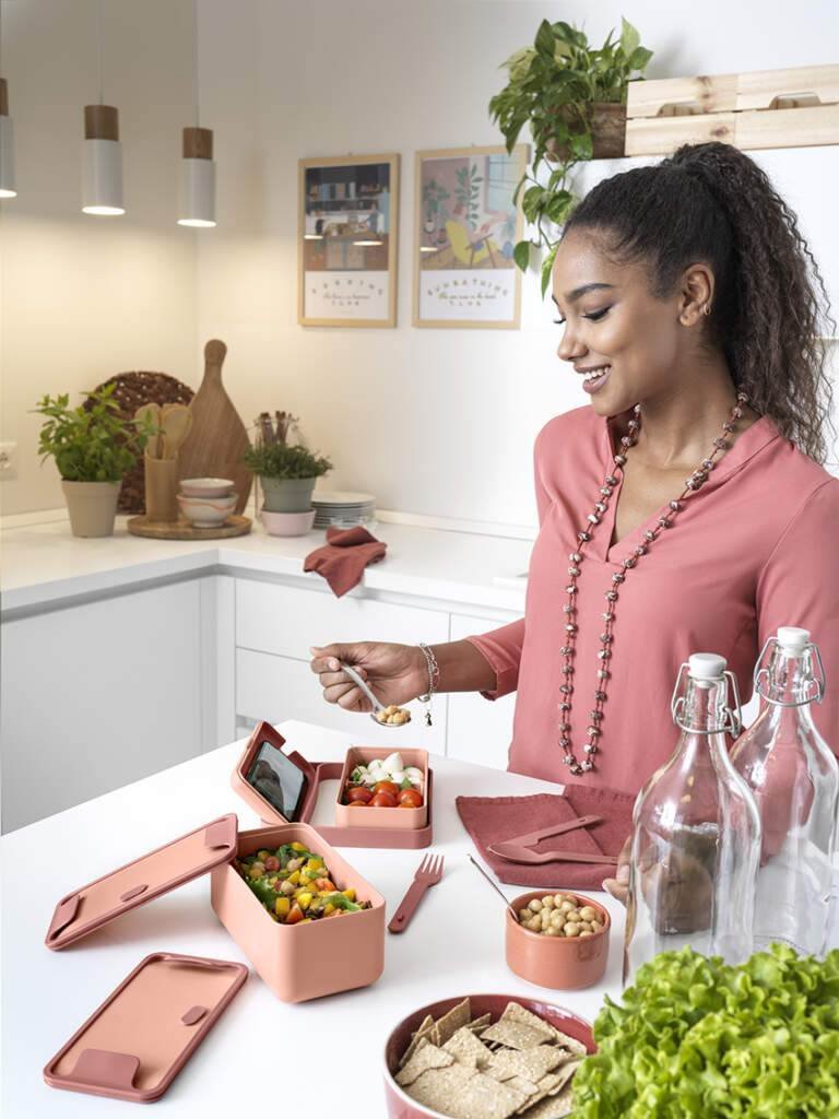 Blim+, infatti, non tralascia alcun particolare come la valvola di sfiato che migliora la resa in microonde, le posate che occupano il minimo spazio una sull’altra e che sono studiate ergonomicamente per un miglior comfort di utilizzo, il coperchio che oltre a essere ermetico può diventare un pratico supporto per cellulare corredato di foro per il cavo di ricarica o per le cuffie, senza dimenticare l’incantevole palette di sei colori mat che virano dal Flamingo Pink fino al Carbon Black.