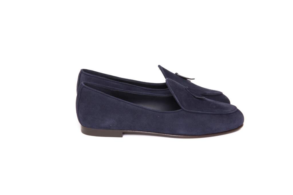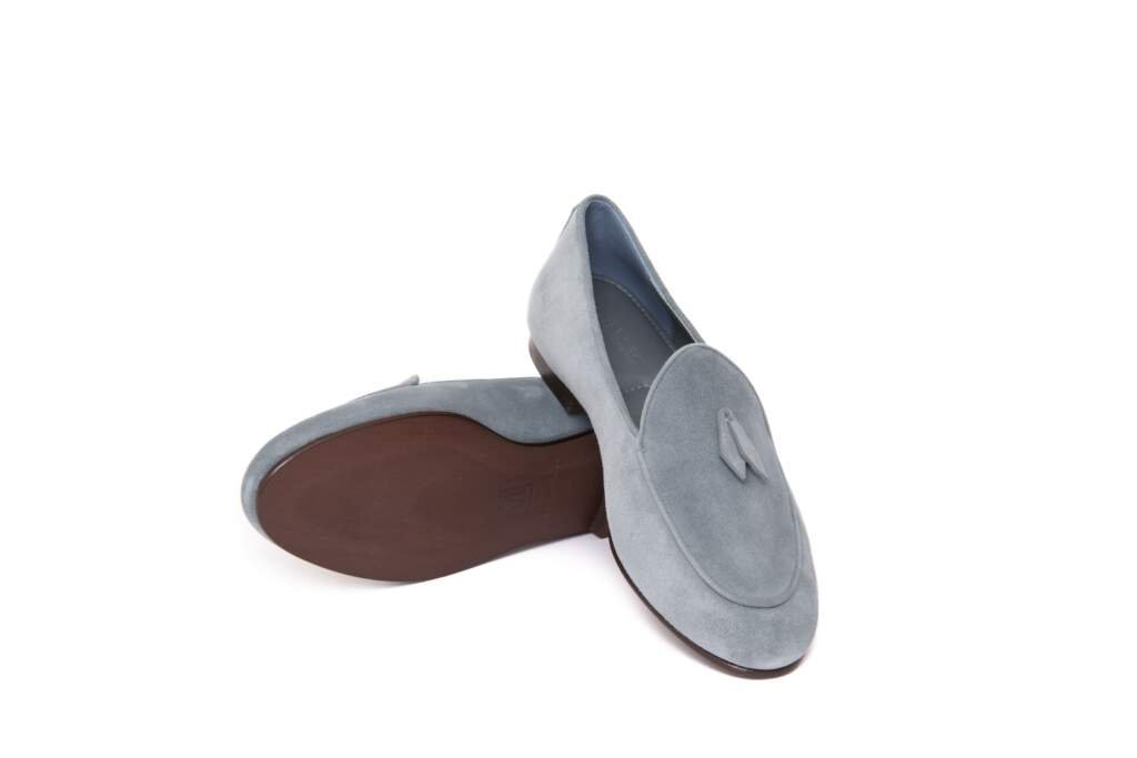 Eleganti loafers scamosciati con fiocchettino puntato a mano, in 4 varianti colore: azzurro carta da zucchero, blue navy, beige e verdone.