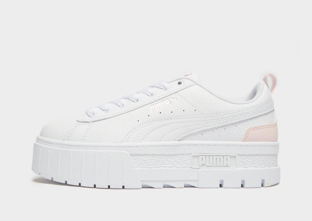 Arrivano le nuove sneakers Puma Mayze bianche con dettagli color pesca, disponibili presso JD. Sono proposte sia nella versione per la mamma che in quella mini con rifiniture in pelle, suola in gomma robusta e intersuola platform che garantisce il massimo dell’ammortizzazione.