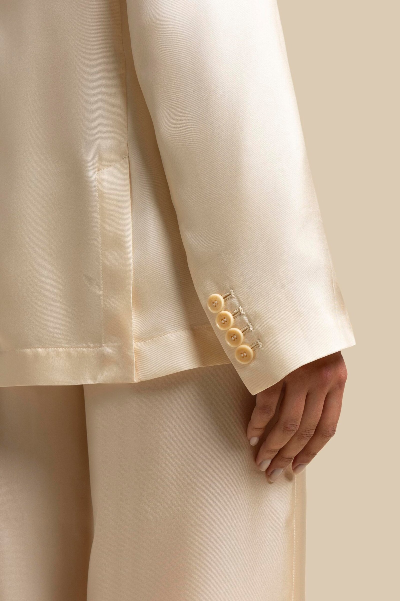 Dalle linee sofisticate, il raffinato completo composto da blazer con vestibilità over, bottone ton su ton in corozo, l’avorio vegetale, e scollatura profonda, e dai pantaloni modello palazzo, con gamba ampia, entrambi in puro twill di seta.