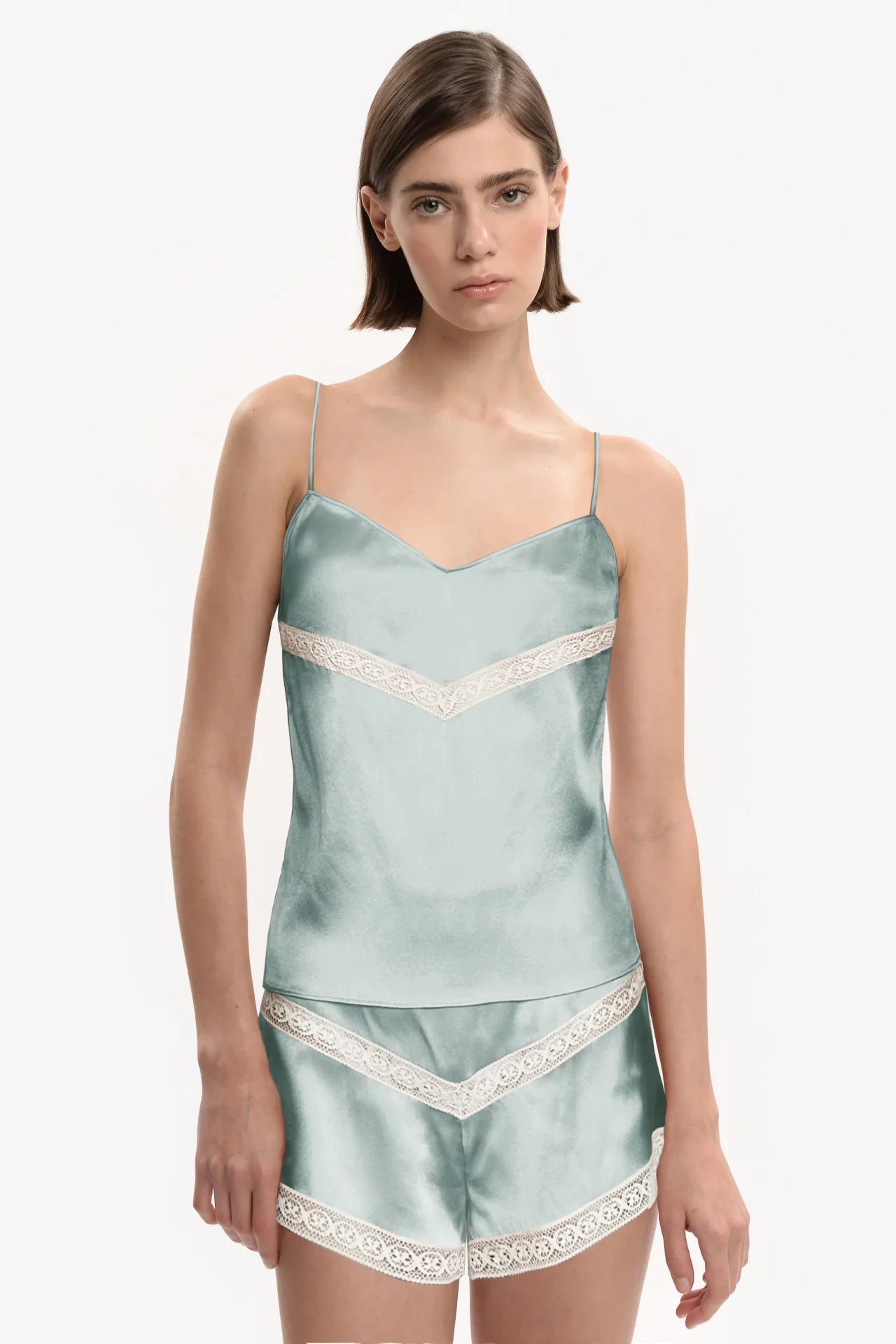 Il Top in raso di seta color pastello ha lo scollo a V, spalline sottili e pizzo vintage in entre-deux selezionato dall’archivio Kristina Ti. È abbinato alla Culotte in raso di seta color pastello con elastico in vita e pizzo vintage in entre-deux, sempre selezionato dall’archivio Kristina Ti.