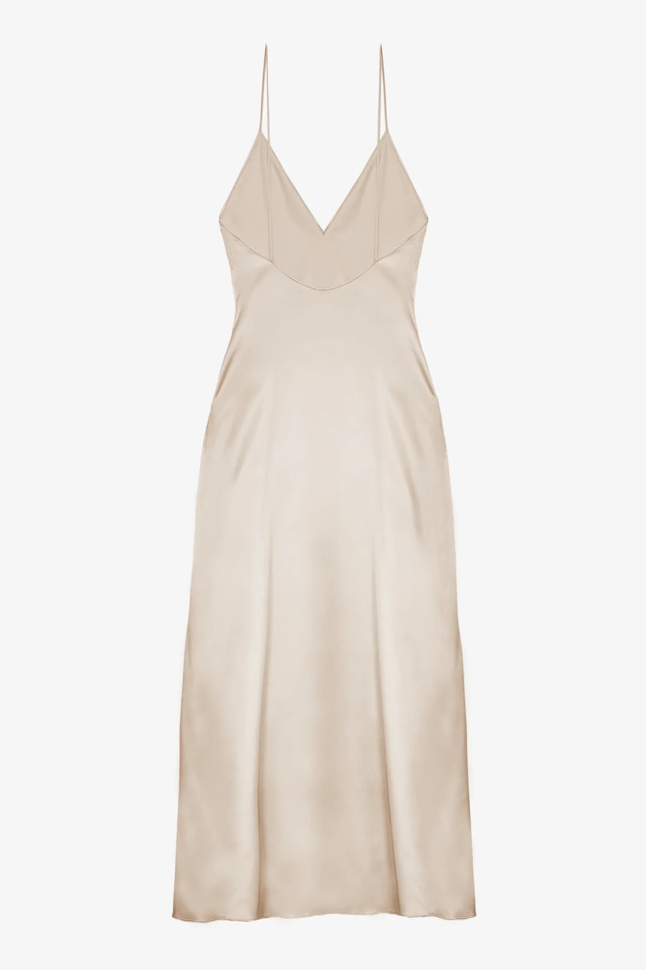 La Sottoveste lunga fino ai piedi in raso di seta color pastello con profondo scollo a V sul décolleté ha una profonda scollatura sul retro che scopre la schiena.