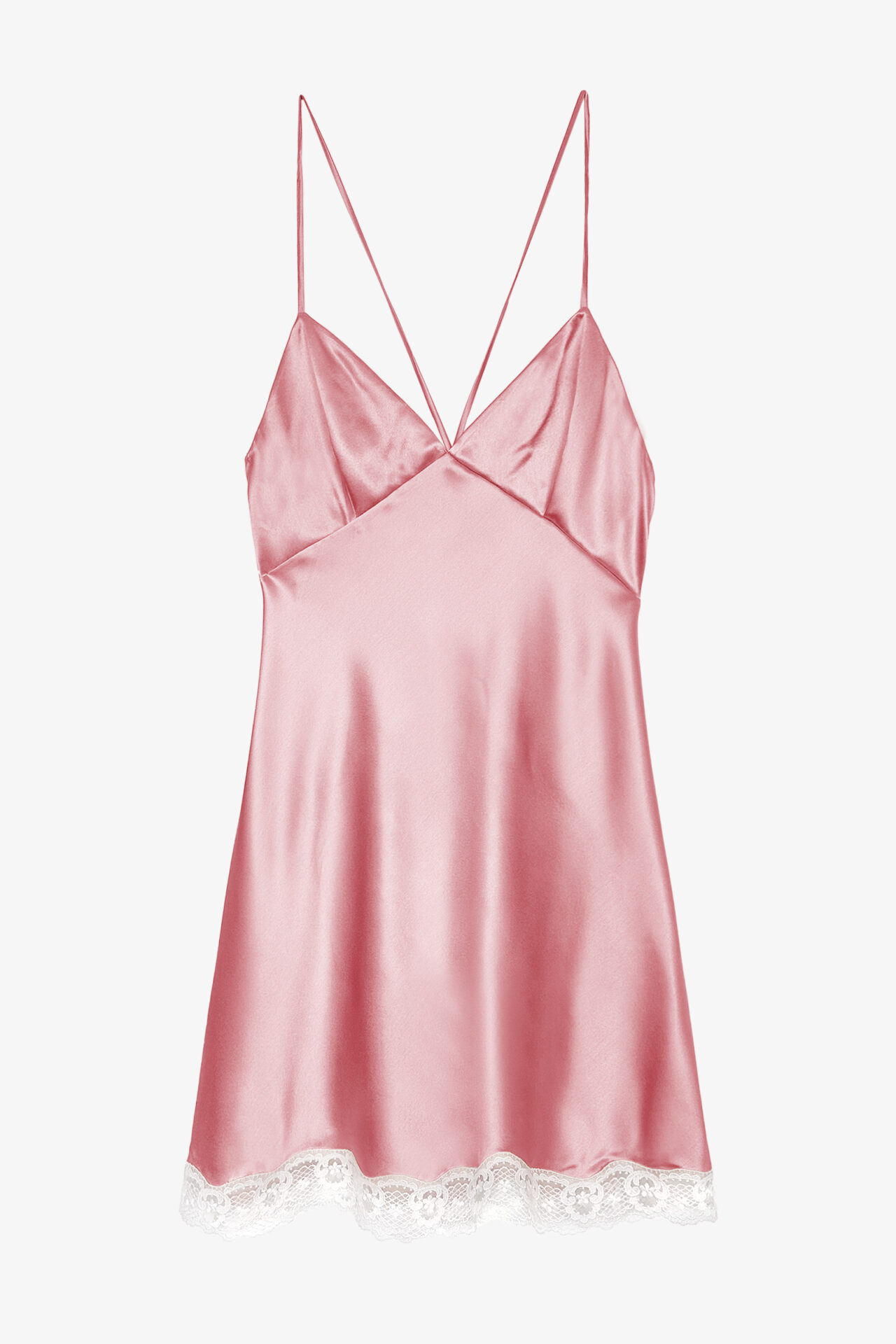 La sottoveste corta sensuale in raso di seta color pastello con scollo a V ha le spalline sottili regolabili sulla schiena nuda, con profilo in pizzo vintage.