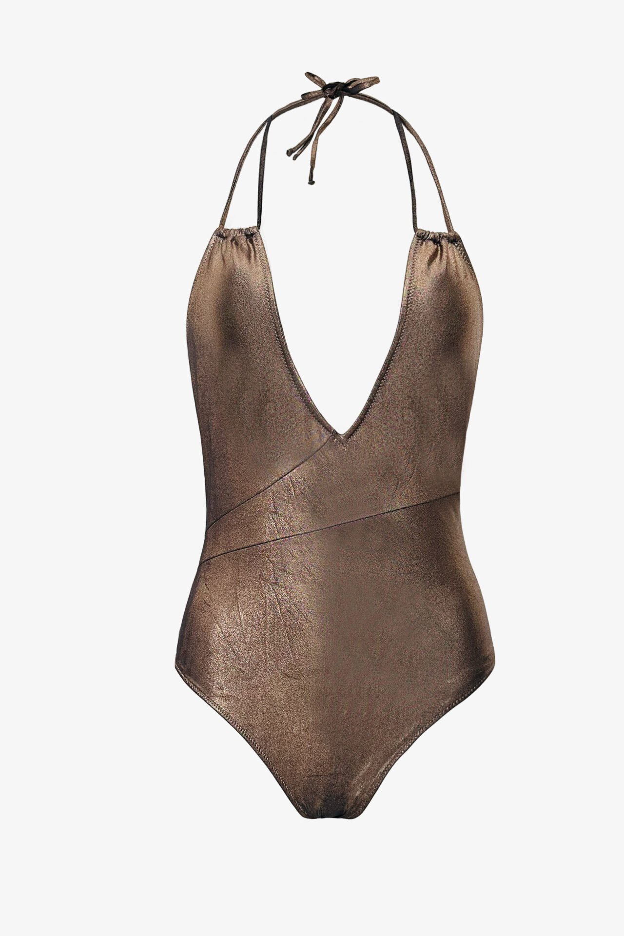 Cattura l’essenza delle opere in argilla bruciata di Sodi. I tessuti riflettenti e le tonalità metalliche, infatti, evocano l’energia termica e grezza della terra, mentre regalano alla collezione un’atmosfera cosmica e ultraterrena.
