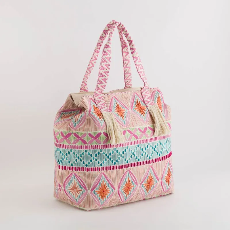 Shopping linea Ostuni by Carpisa. In tessuto green oriented stampato all over con fantasia multicolore a balze. La stampa, inoltre, è arricchita da inserti in raffia e perline. Chiusura con zip, tasche interne e manici in nastro jaquard bi-colore con motivo geometrico.