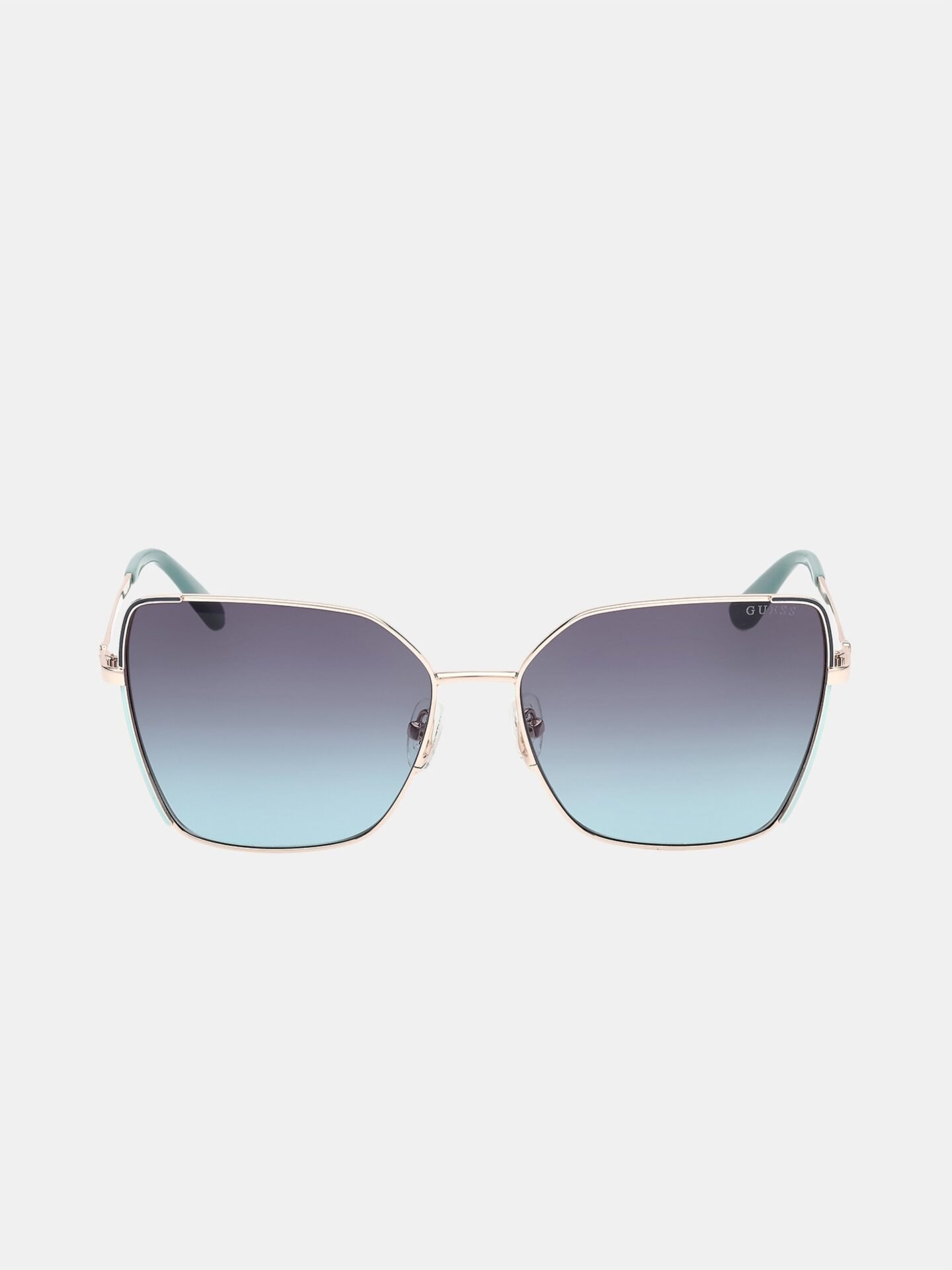 Guess Modello a farfalla in metallo. è il nuovo modello con aste in metallo con logo in oro chiaro lucido. Lenti blu sfumato.