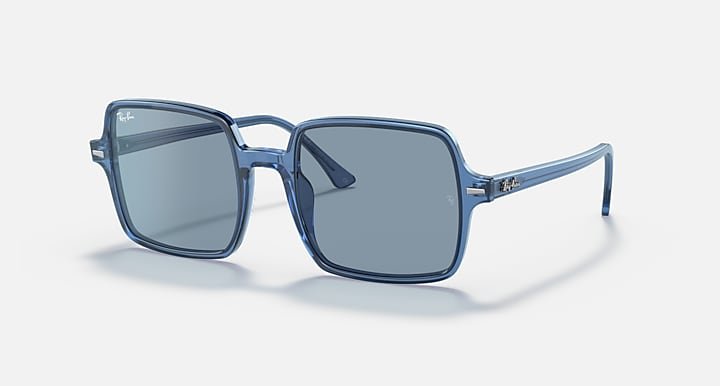 Ray Ban Square II True Blue sfoggia una montatura squadrata in acetato in Lucido Blu Trasparente, mentre le lenti sono in Classic Blu