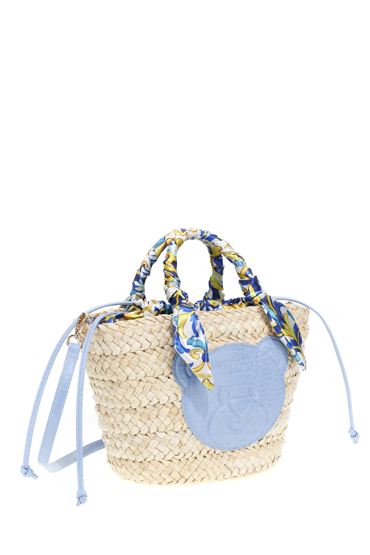 Rue Madam Paris Amalfi.Borsa in paglia impreziosita da manici rivestiti in tessuto colorato e decorata con l’iconico orsacchiotto.