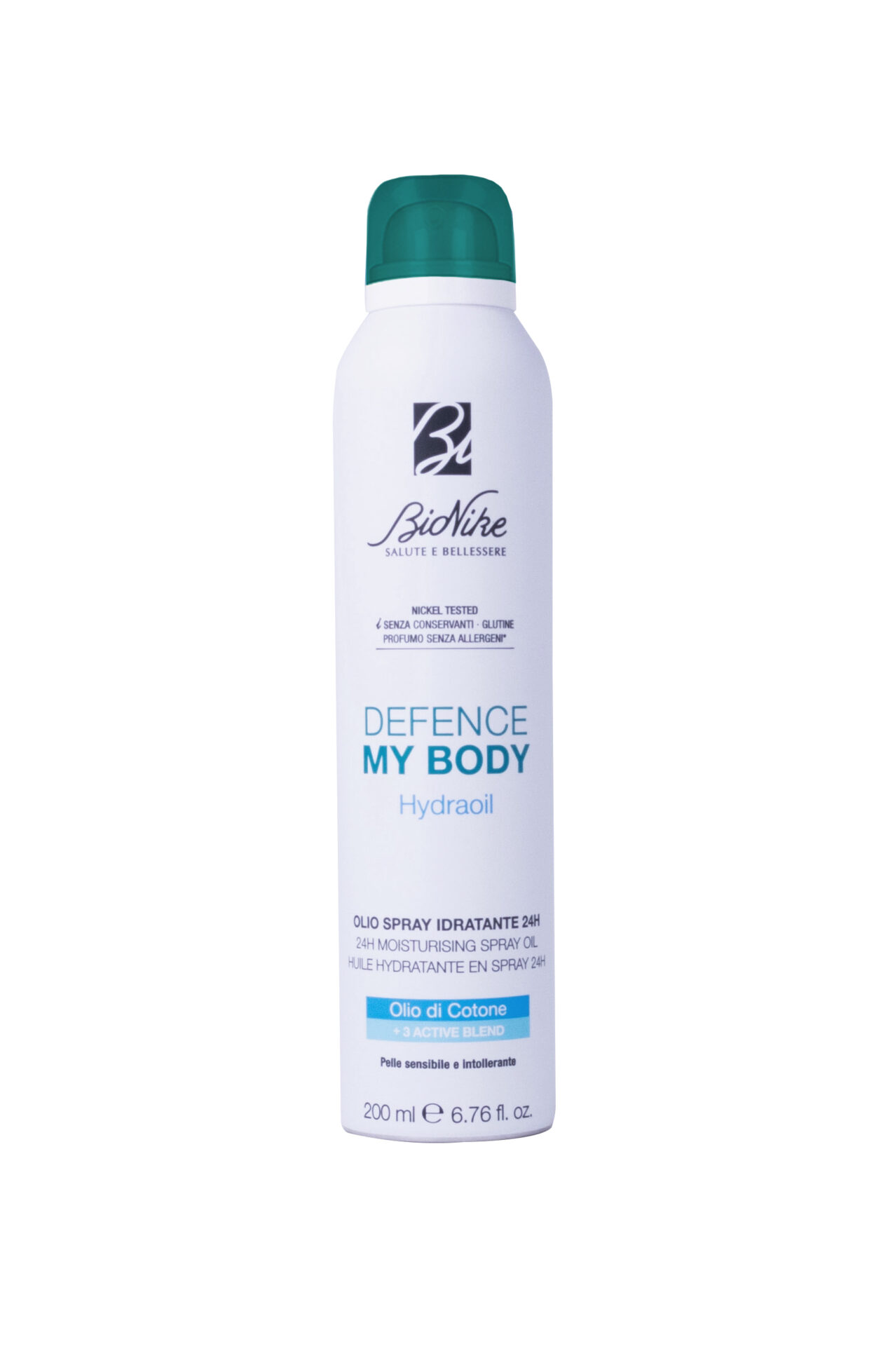 Defense MY Body HydraOil Olio Spray Idratante 24h Bionike Nuovo spray olio ad azione emolliente e idratante dalla texture leggera e non-oil che si fonde sulla pelle donando nutrimento.Contiene olio di cotone con azione antiossidante, lenitiva e idratante e 3 attivi nutrienti. Olio di Karitè, emolliente con tocco leggero; vitamina E , che migliora la funzione barriera cutanea e, grazie alle proprietà antiossidanti, protegge la pelle da secchezza e screpolature. Infine, olio di mandorle dolci, olio vegetale con elevato potere emolliente e alta tollerabilità.