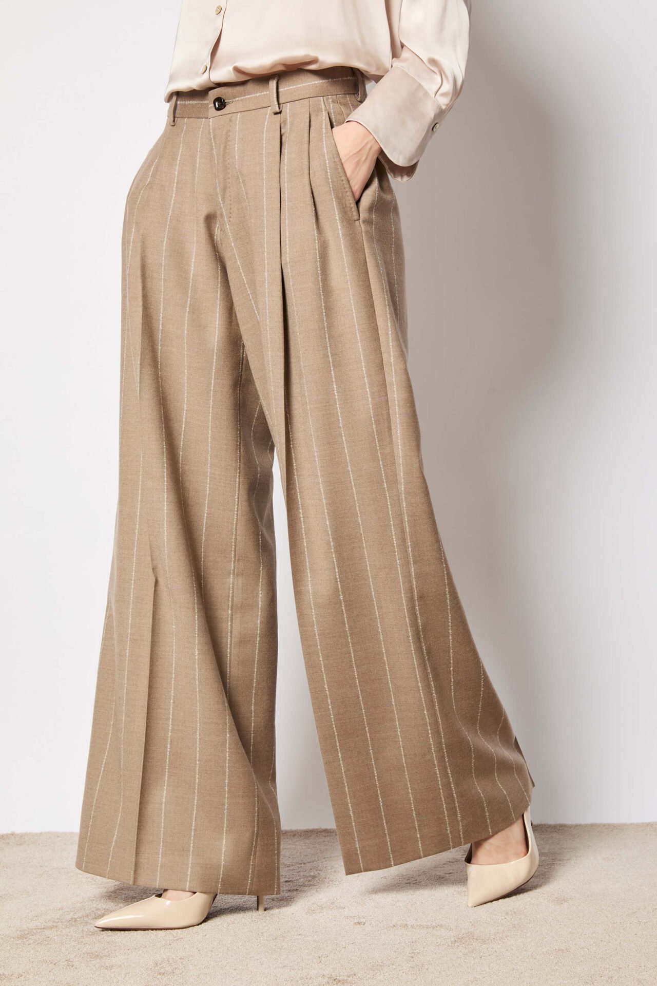 L.B.M. 1911 Blazer Claudia in fantasia gessata che alterna il color nocciola al bianco avorio. La silhouette over è valorizzata da rever a lancia, taschino sul petto e tasche applicate sul davanti. La chiusura doppiopetto, inoltre, è completata da bottoni in metallo con finitura argento satinato. Il Pantalone palazzo Elisa, infine, è in lana vergine leggermente stretch in fantasia gessata. Gamba ampia e piega stirata.
