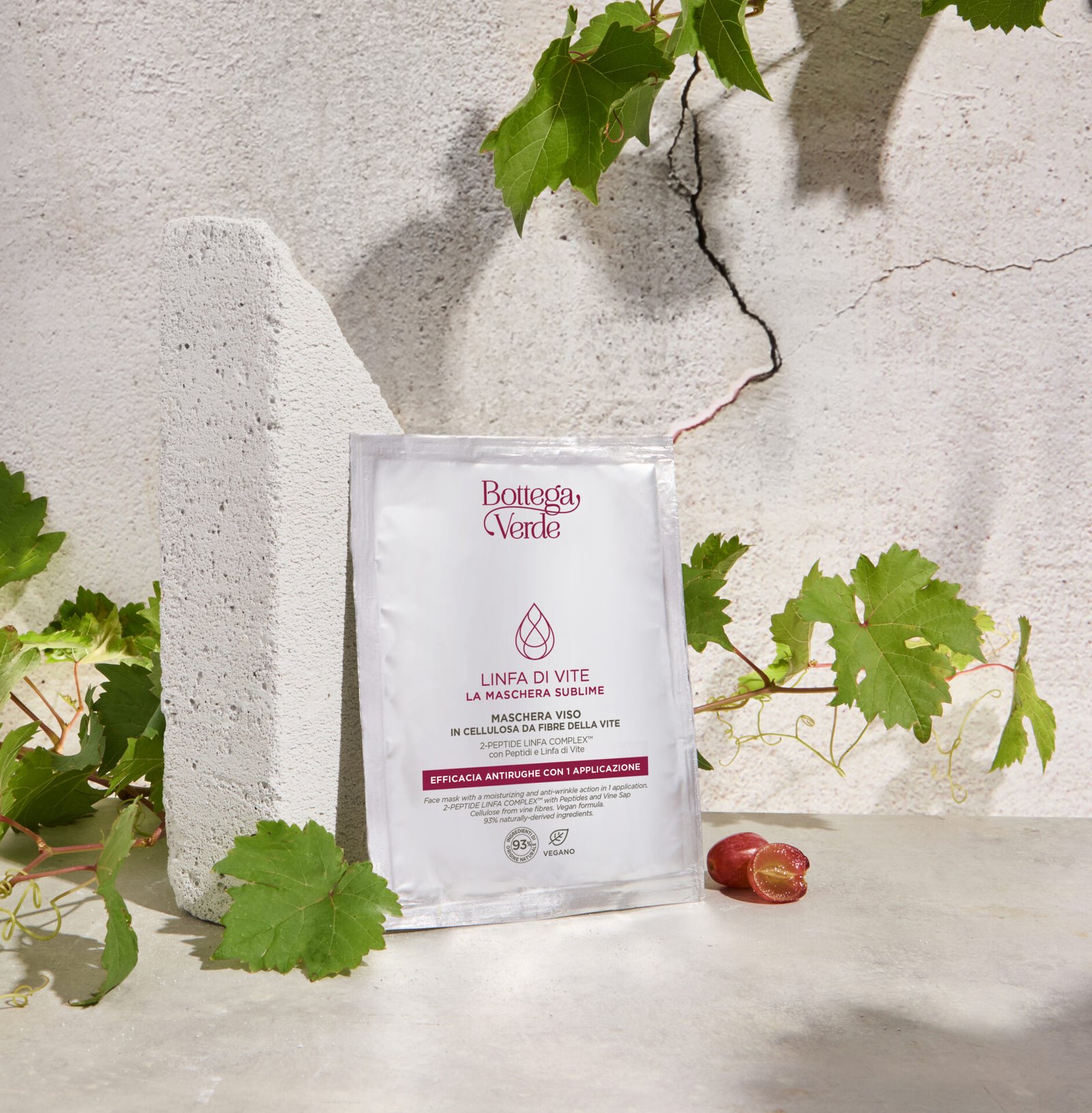 Maschera Viso in cellulosa da fibre della vite Bottega Verde Maschera in cellulosa di origine naturale, derivata da fibre e raspi della vite recuperati da cicli di lavorazione dell’uva, che conferiscono un delicato colore rosa al tessuto. Adatta a tutti i tipi di pelle è imbibita con una lozione ricca di principi funzionali ad azione idratante e antirughe. Ma contiene anche 2-PEPTIDE LINFA COMPLEX™: un nuovo blend che combina 2 Peptidi di ultima generazione, Linfa di vite e il fitocomplesso di Uva rossa di Tenuta Bottega Verde. Una volta stesa sul viso regala una sensazione di freschezza rigenerante.
