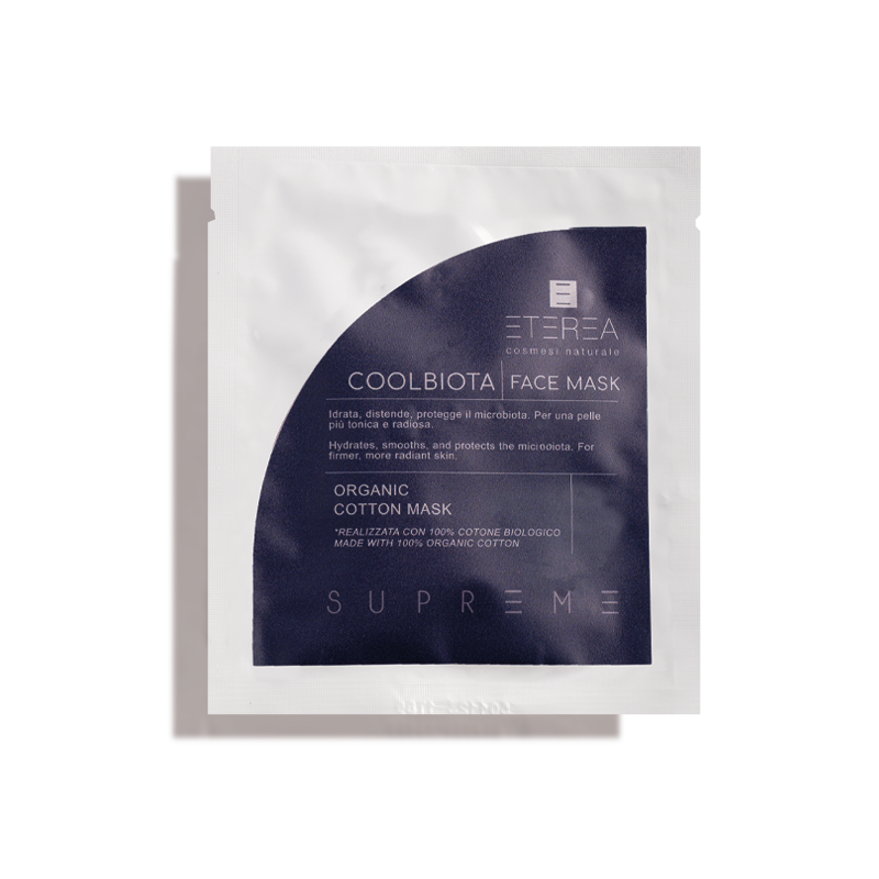 Supreme Coolbiota Face Mask Eterea Cosmesi Naturale. Maschera viso in cotone biologico, ideale per un’idratazione intensa e un comfort immediato. Con acqua distillata d’orzo lenitiva, acido ialuronico a basso peso molecolare per un effetto rimpolpante, opuntia ficus-indica stem extract e opuntia ficus indica callus culture extract da fico d’India per stimolare collagene ed elastina. E Biosaccharide Gum-1, con azione idratante, che mantiene il film protettivo della pelle.