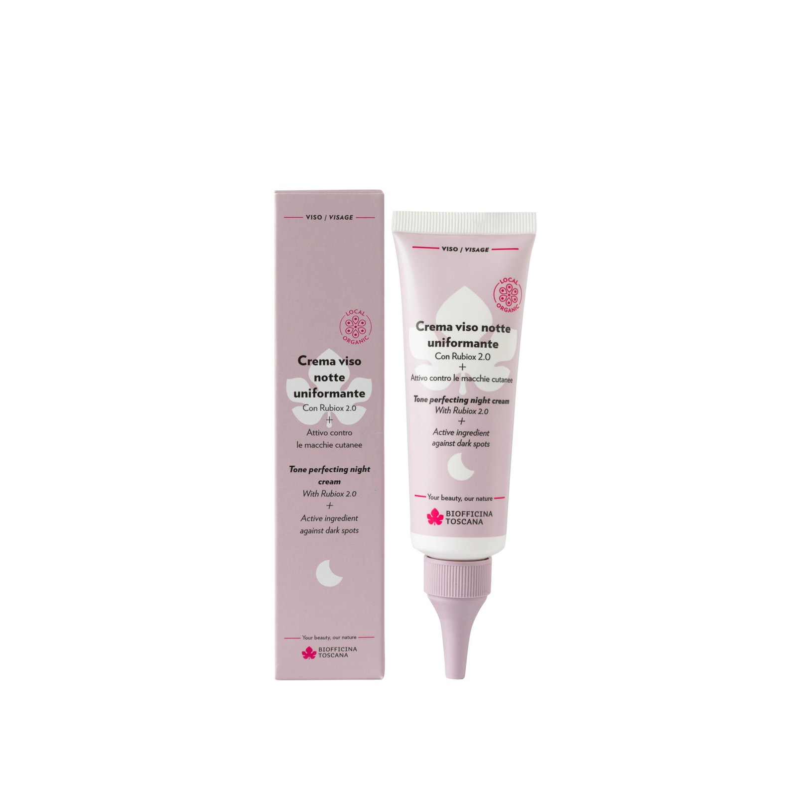 Crema Viso Notte Uniformante Biofficina Toscana Una coccola serale a base di Rubiox® 2.0, esclusivo bioliquefatto da rosa canina ricca di vitamina C e frutti rossi bio toscani con funzione antiossidante-protettiva, unito ad altri attivi antiossidanti ad azione mirata contro le macchie cutanee. Una texture vellutata che nutre in profondità senza appesantire. Illumina e uniforma l’incarnato. Un estratto derivato dai fiori della margherita selvatica interviene infatti nei processi di melanogenesi, contribuendo a ridurre la visibilità delle macchie cutanee ed esercita un’azione illuminate, mentre un altro principio attivo a base di estratto di fico d’india 100% made in Italy completa l’azione idratante-antiossidante.
