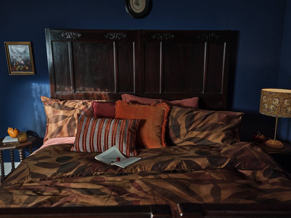 Nella zona notte, i set letto in percalle e raso di cotone uniscono finezza e durata, mentre le spugne in velour o a rilievo si tingono di colori autunnali e motivi geometrici.