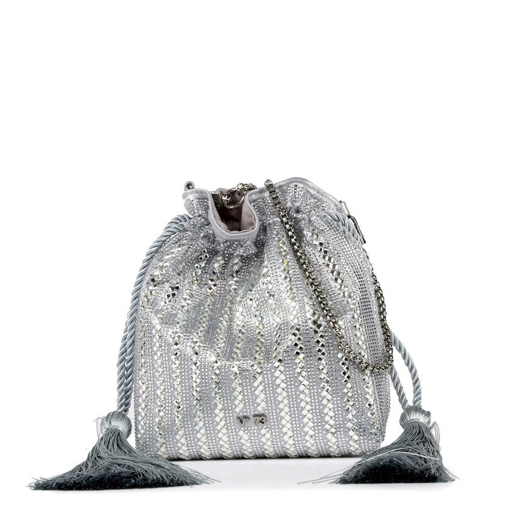 Borsa a spalla Dorothy V°73 Minibag in raso argento con pietre taglio baguette. Letterine metalliche applicate.