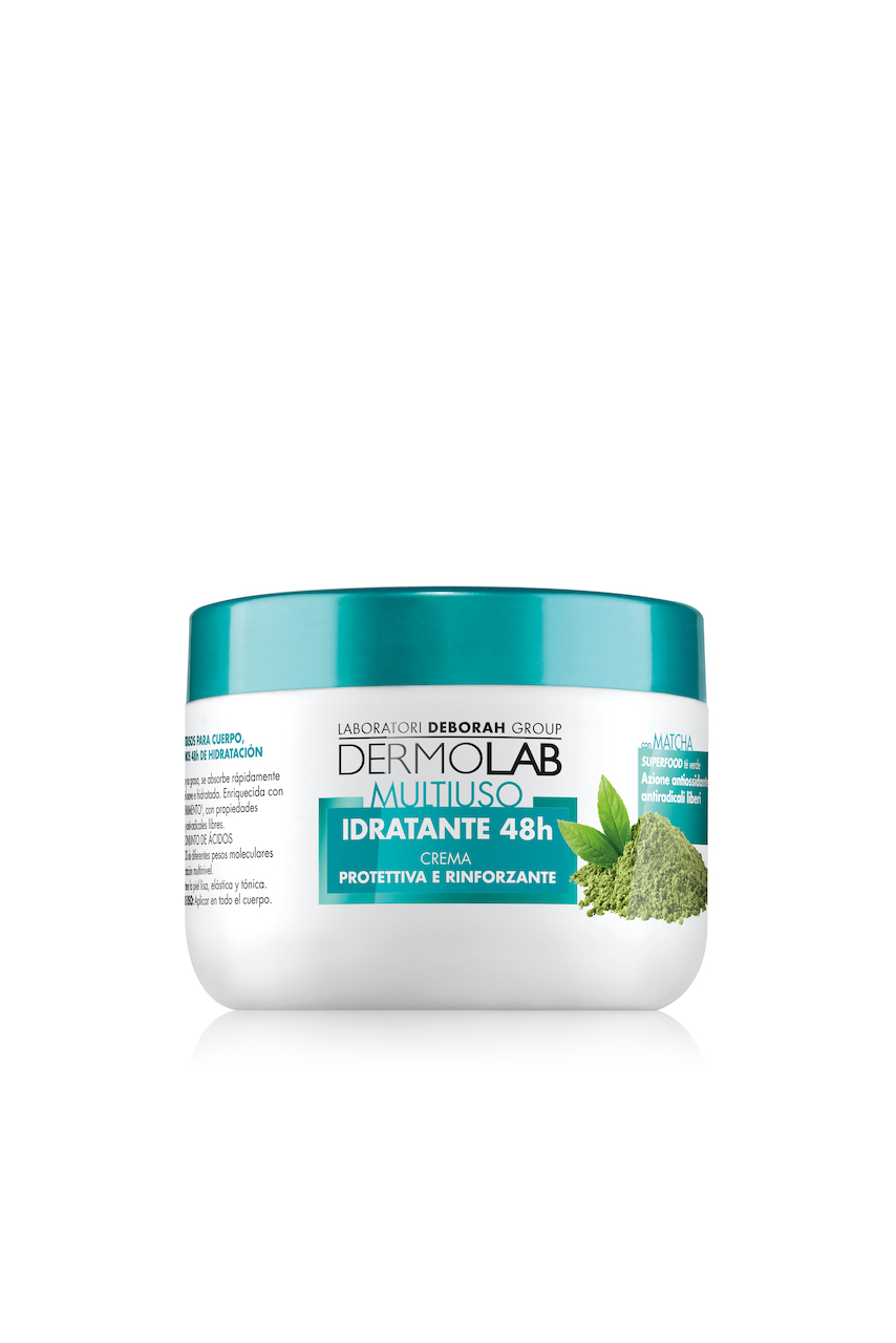 Crema multiuso protettiva e rinforzante 48h Dermolab Texture fresca e non grassa, si assorbe rapidamente lasciando la pelle morbida ed idratata. Texture leggera e dal facile assorbimento, ideale per viso, corpo e mani. Con matcha dalle potenti proprietà antiossidanti e antiradicali liberi. Prebiotico naturale, che, rinforzando ed equilibrando la naturale flora cutanea, contribuisce a ripristinare la barriera cutanea e a proteggere la pelle dalle aggressioni dell’ambiente esterno, responsabili dell’invecchiamento. Infine, il pool di acidi ialuronici ad alto e medio peso molecolare per un’idratazione multilivello svolgono azione immediata in superficie e rilascio prolungato in profondità.
