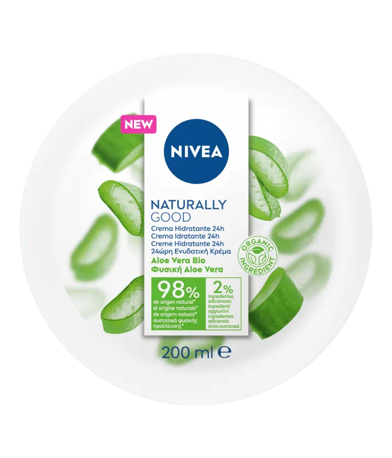 Nivea Naturaly Good Crema Multiuso Il potere di Nivea incontra la freschezza e le proprietà dell’Aloe Vera Bio in una crema green. Dona alla pelle di corpo, viso e mani 24 ore di idratazione senza ungere. La formula contiene il 98% di ingredienti di origine naturale; è arricchita con Aloe Vera Bio e lascia la pelle idratata a lungo.