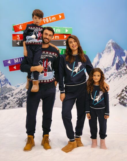 La capsule collection include comodi maglioni e pigiami per tutta la famiglia ma anche maglie termiche, calze e parigamba su cui campeggiano l’emblema ufficiale di Milano Cortina 2026 e Tina, la mascotte dei Giochi Olimpici.