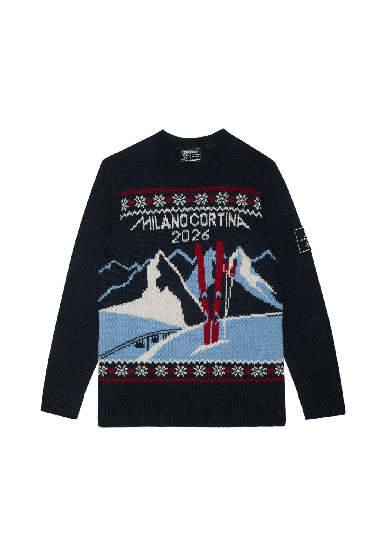 La capsule collection include comodi maglioni e pigiami per tutta la famiglia ma anche maglie termiche, calze e parigamba su cui campeggiano l’emblema ufficiale di Milano Cortina 2026 e Tina, la mascotte dei Giochi Olimpici.