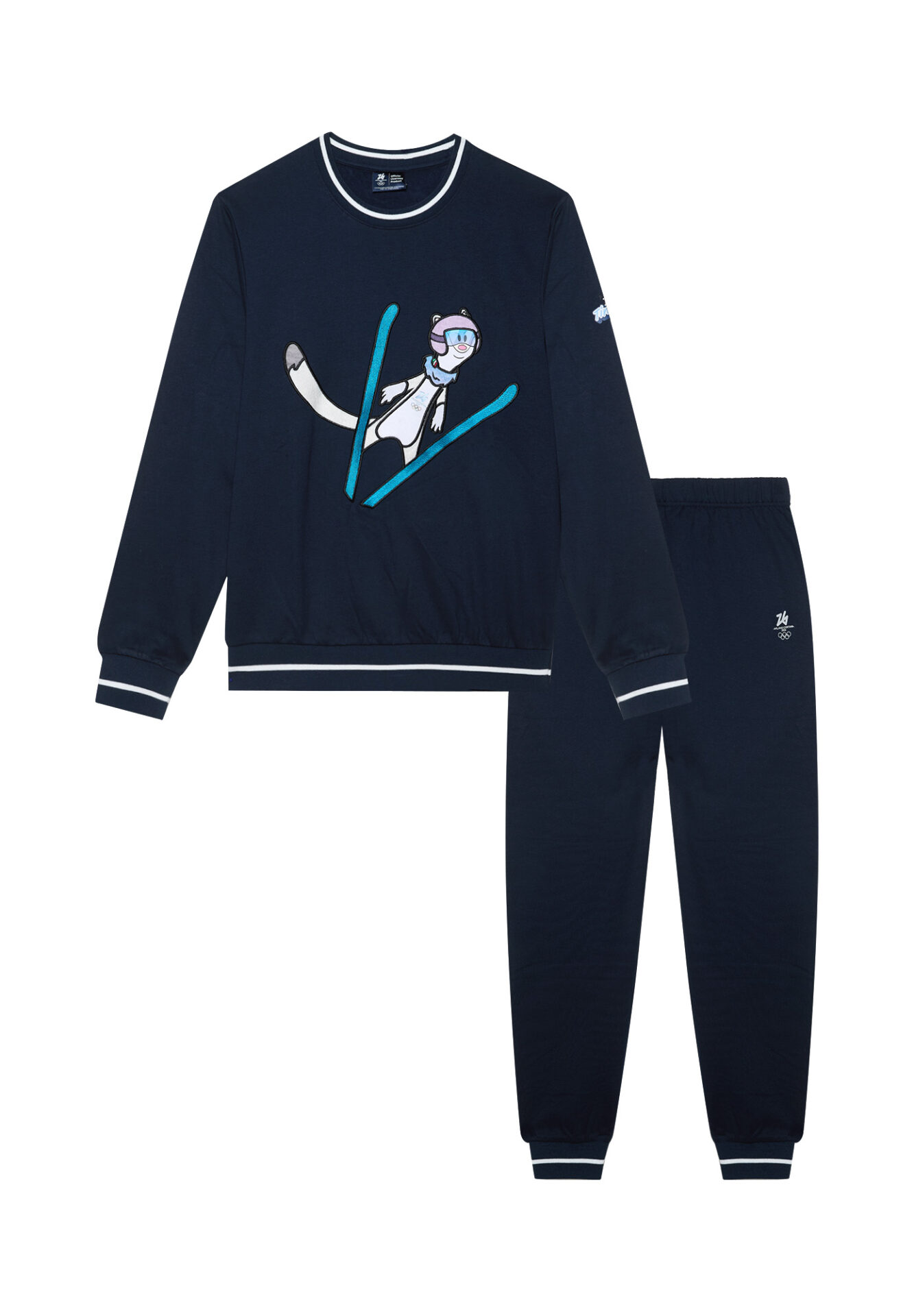Il Pigiama lungo unisex in cotone garzato caldo e morbido. Composto da maglia blu con stampa Milano Cortina 2026 e pantaloni coordinati con polsini alla caviglia. Il tessuto garzato interno assicura una piacevole sensazione di calore. Mentre la vestibilità regolare offre comfort per il relax domestico. Perfetto per vivere la magia olimpica anche nei momenti di relax.